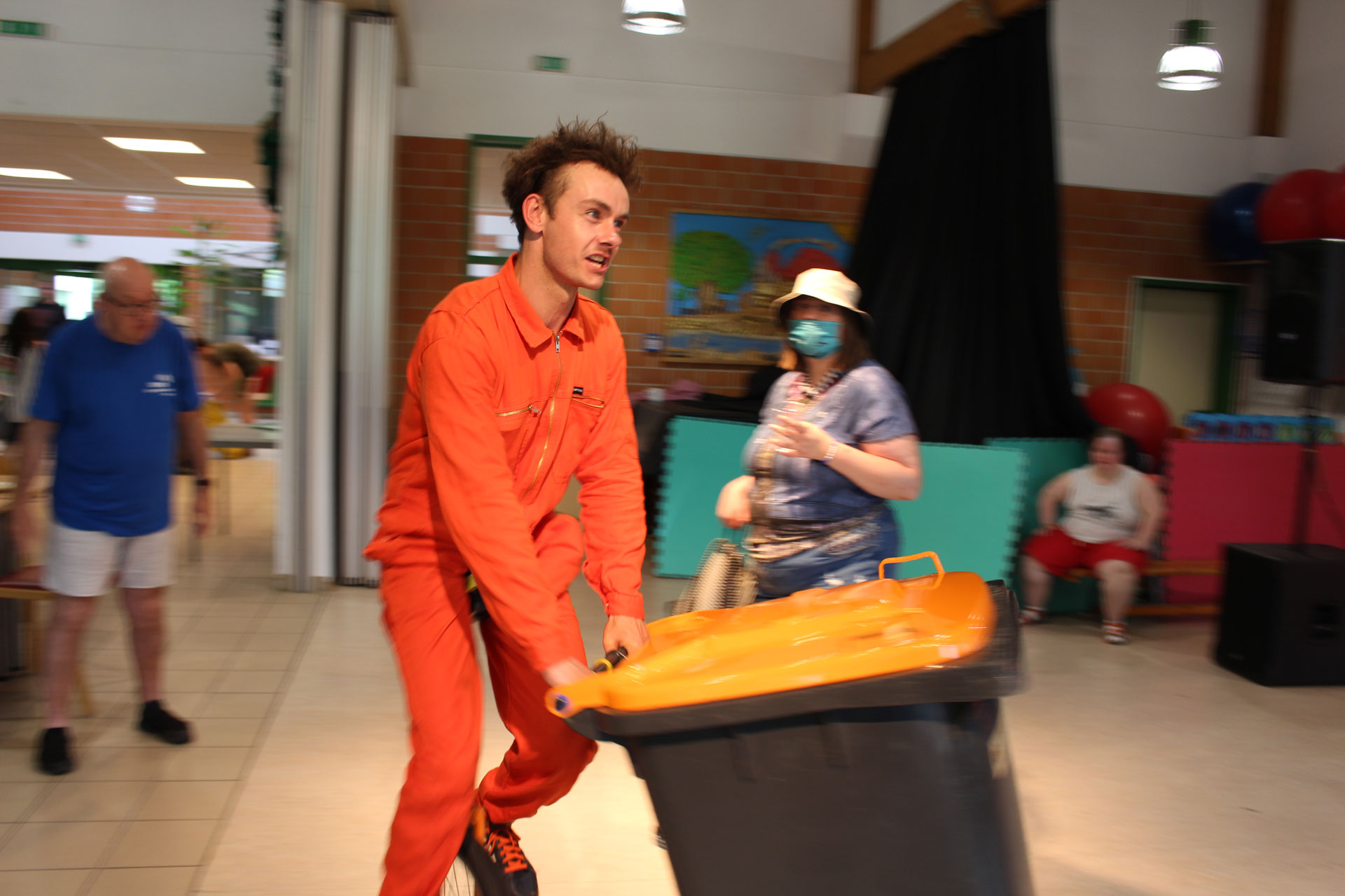 Bild 4: Der Kaosclown bereicherte die Jubiläumsfeier mit seinen furiosen Auftritten und besuchte jeden Standort. Hier im Speisesaal in der Betriebsstätte am Flutgraben.